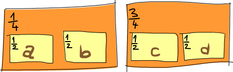 至於 >>= 呢?看起來有點複雜,所以我們換種方式來思考,我們知道 m >>= f 會等價於 join (fmap f m),所以我們來想要怎麼把一串包含 probability list 的 list 弄平。舉個例子,考慮一個 list,'a' 跟 'b' 恰出現其中一個的機率為 25%,兩個出現的機率相等。而 'c' 跟 'd' 恰出現其中一個的機率為 75%,兩個出現的機率也是相等。這邊有一個圖將情形畫出來。